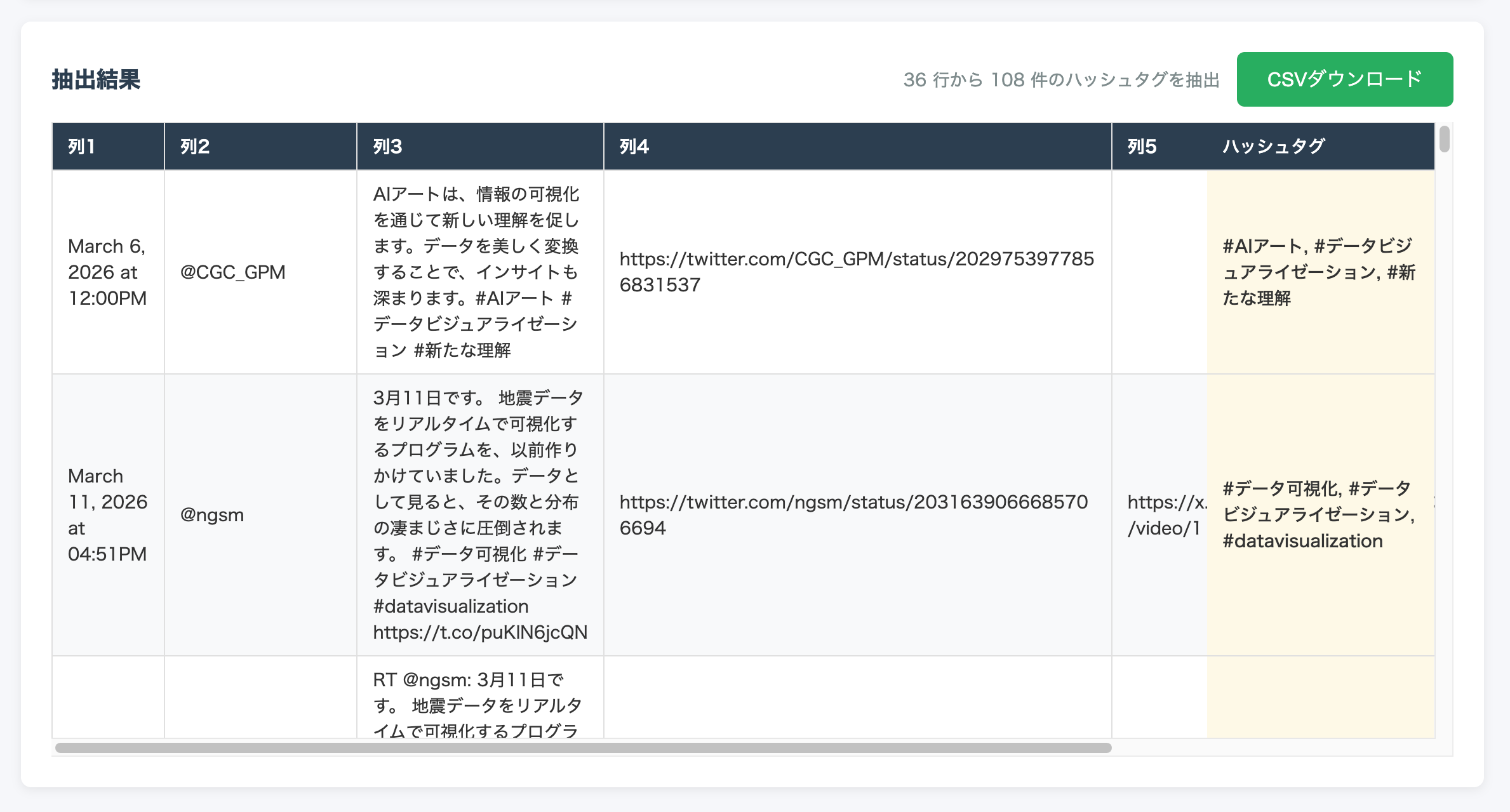 - 抽出設定・実行 — 対象列と抽出タイプ(ハッシュタグ/メンション/URL/メール/電話番号)を選んで「抽出を実行」